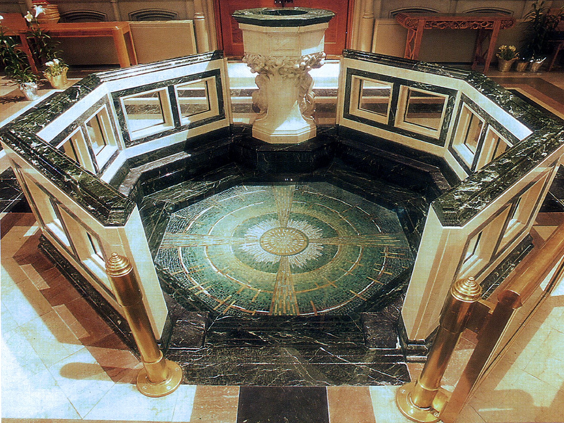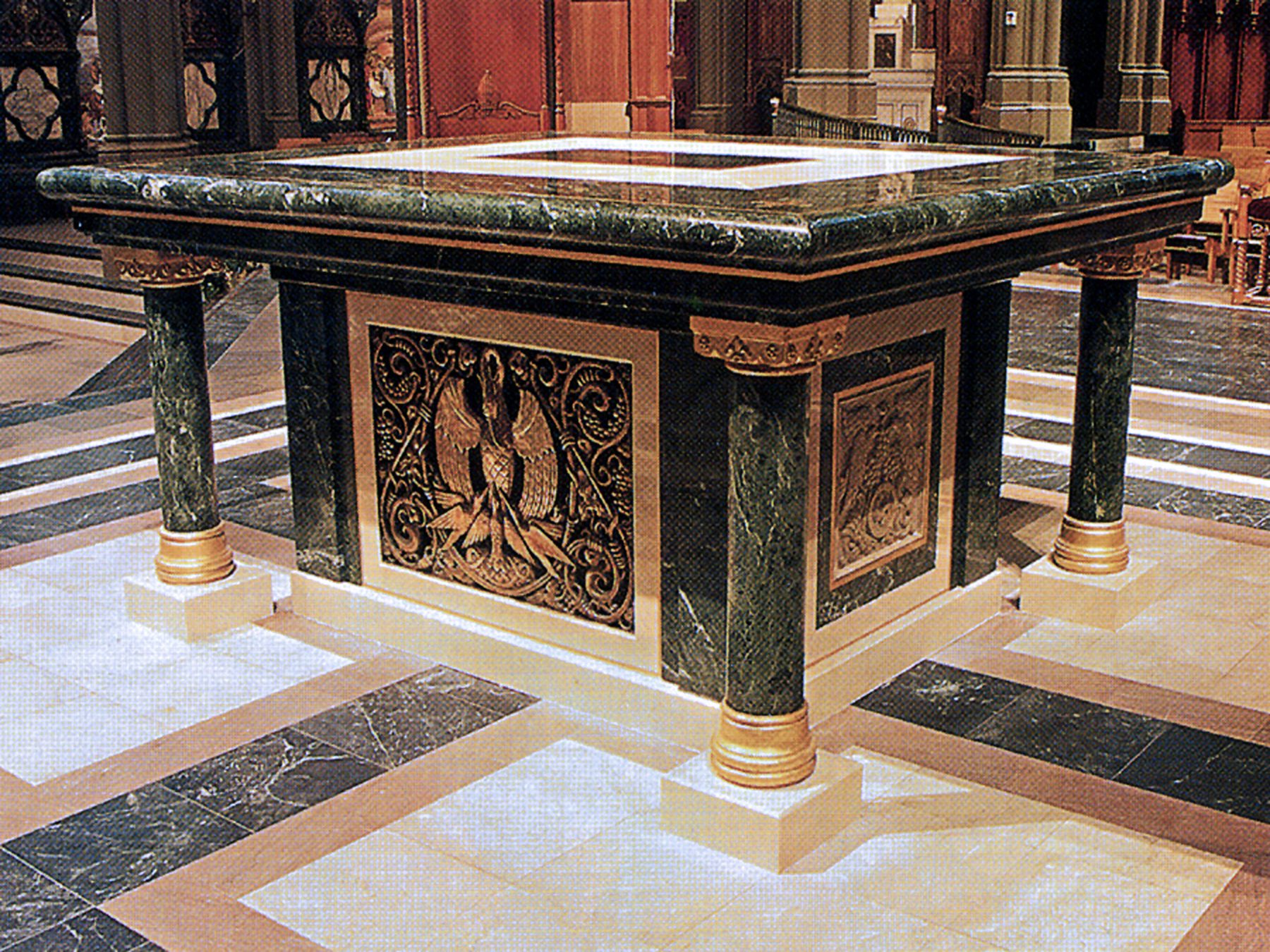 The new altar was fabricated from elements of the former high altar and the bronze gates of communion rail. These were incorporated with additional marble and bronze to create the new altar. The baptismal font was also a composition of the existing baptismal font as an upper basin with the lower basin composed of elements from the existing communion rail and a new cast bronze gate along with mosaics that line the lower basin Project Architect/ Liturgical Design Consultant: William E. Brocious AIA
