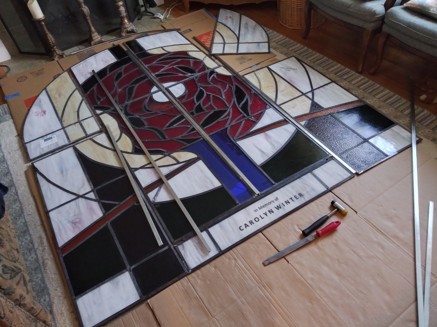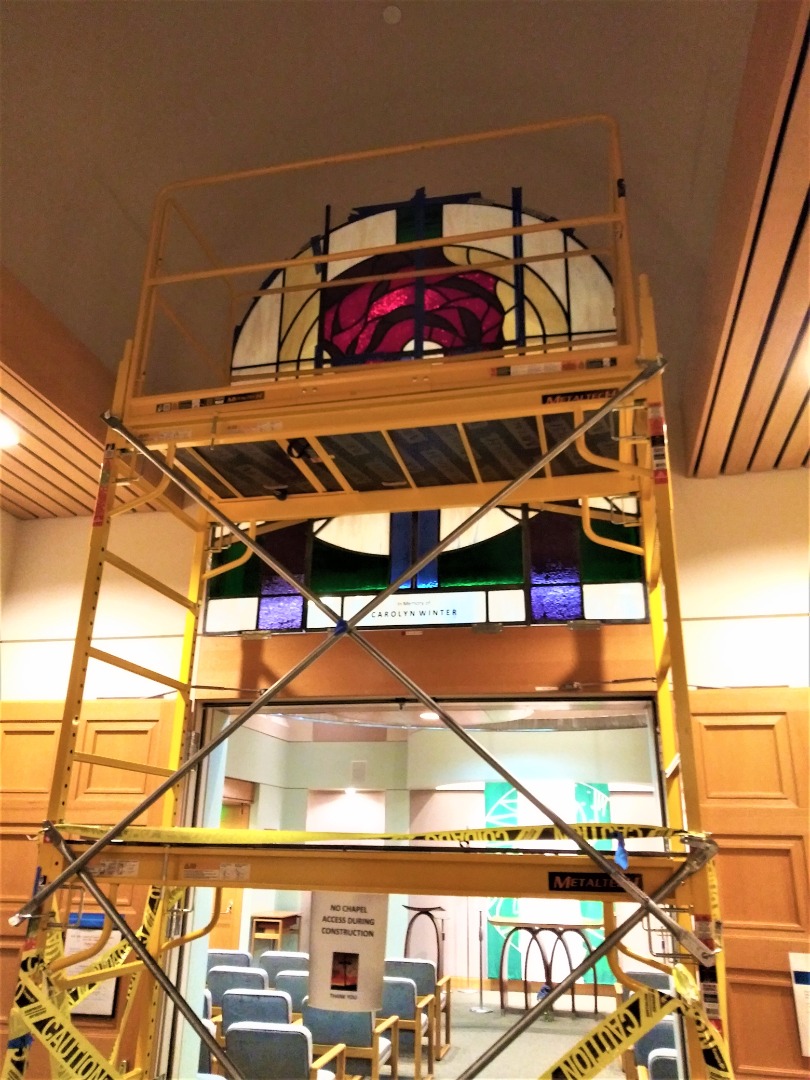 Through a process of concept presentations, a final option was chosen to proceed with fabrication, Fire code and safety restrictions were considered in the final installation of an 6 X 7 ft. window. Final results in framing and backlighting were achieved in combining 9 art-glass panels above the chapel entrance.