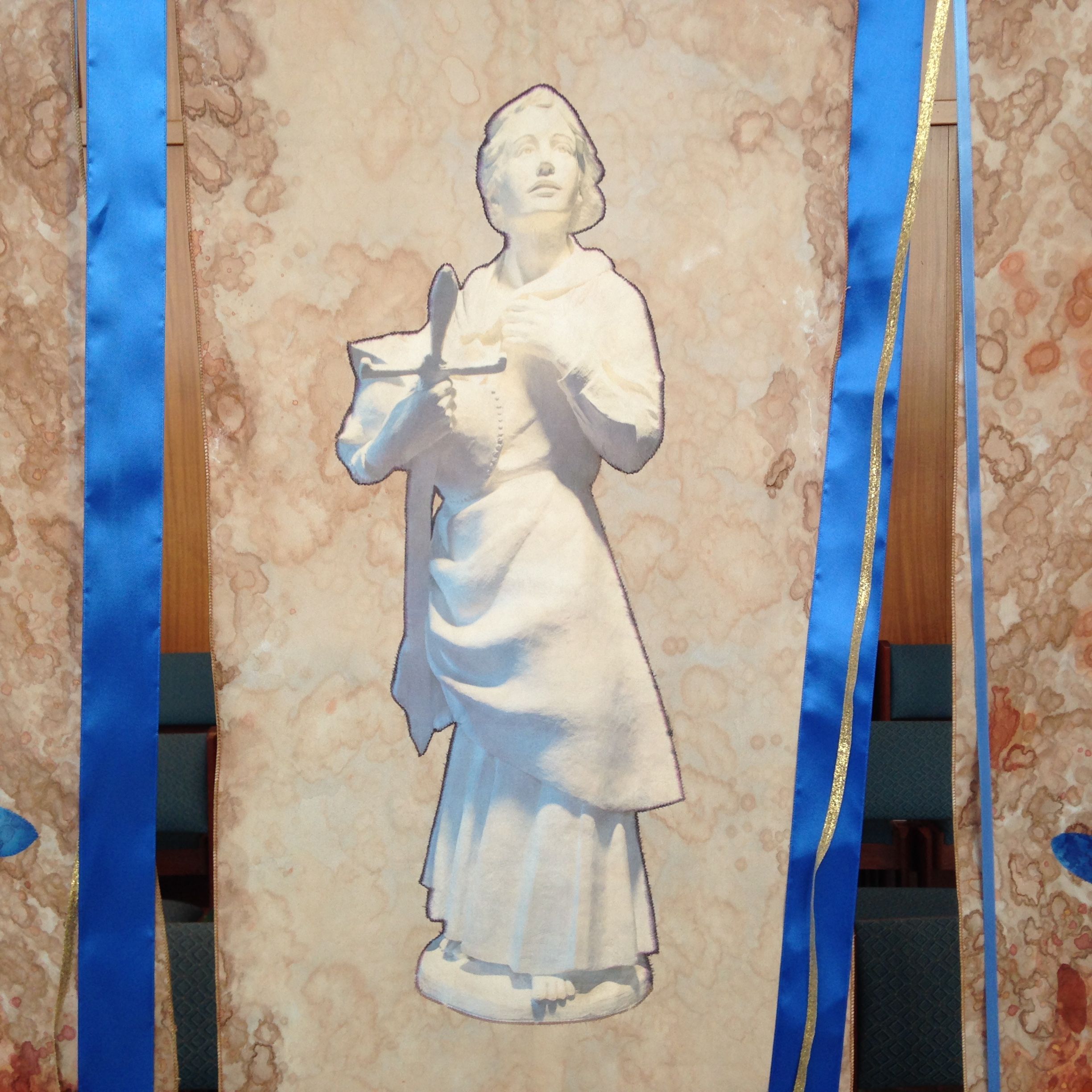 I was approached at a recent conference by the Fr Pat Ferraro of St Joan of Arc Church in Streetsboro, OH with a request to design a banner for their church, featuring their St Joan statue, with rust as the main color and incorporating blue. They could provide me with a photo of the statue. I always enjoy the process of working with a client to develop an interesting solution to such a design problem. I found that if I used the right printer and prepared silk fabric, I could use to print Joan as wide as 8 1/2″ and as long as needed. I could paint more habotai silk a rust color with a light area for the statue. If I split it in three, I could put the name of the church and the town on either side of the statue. In blue! Since Joan had blue shadows, it worked out well.