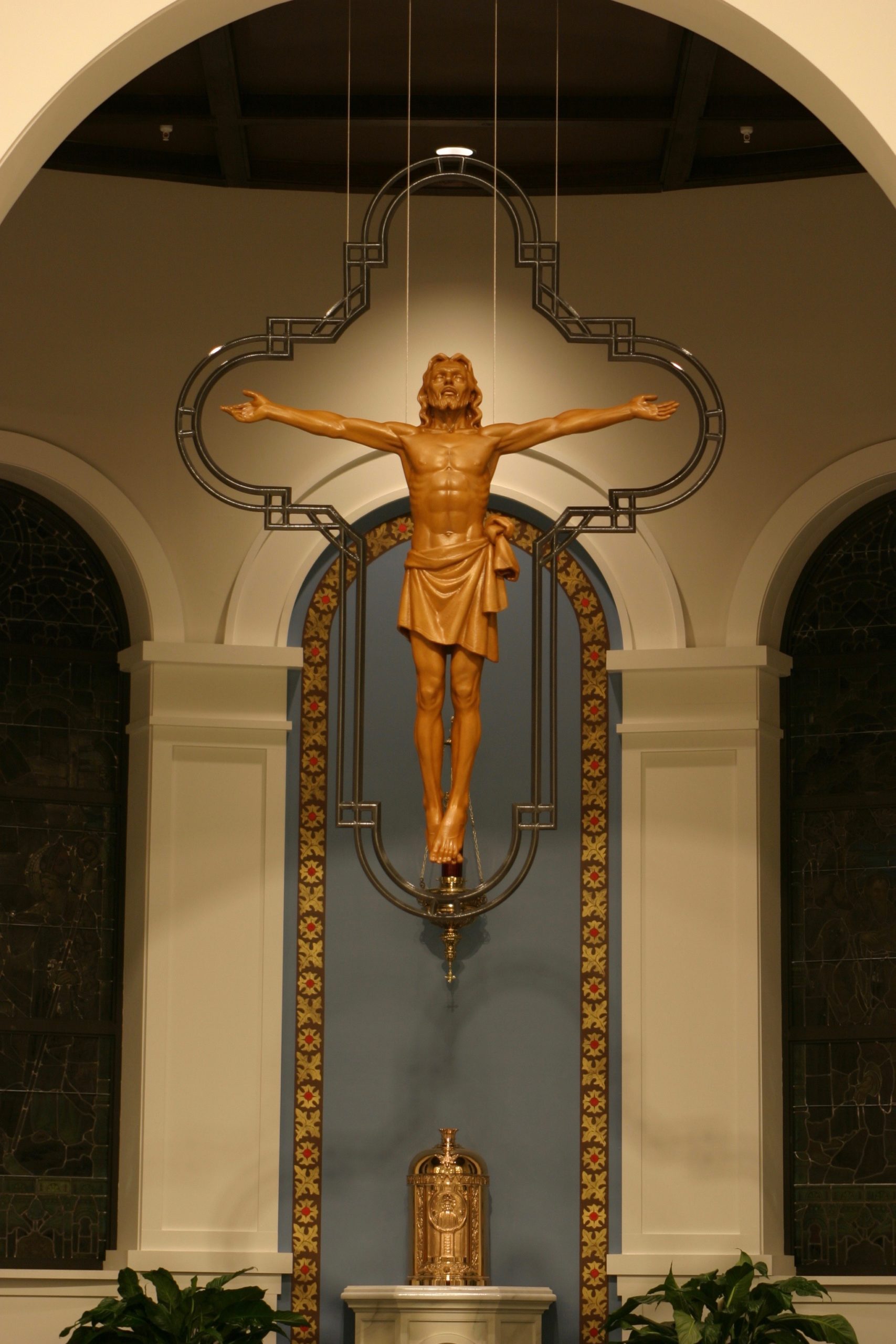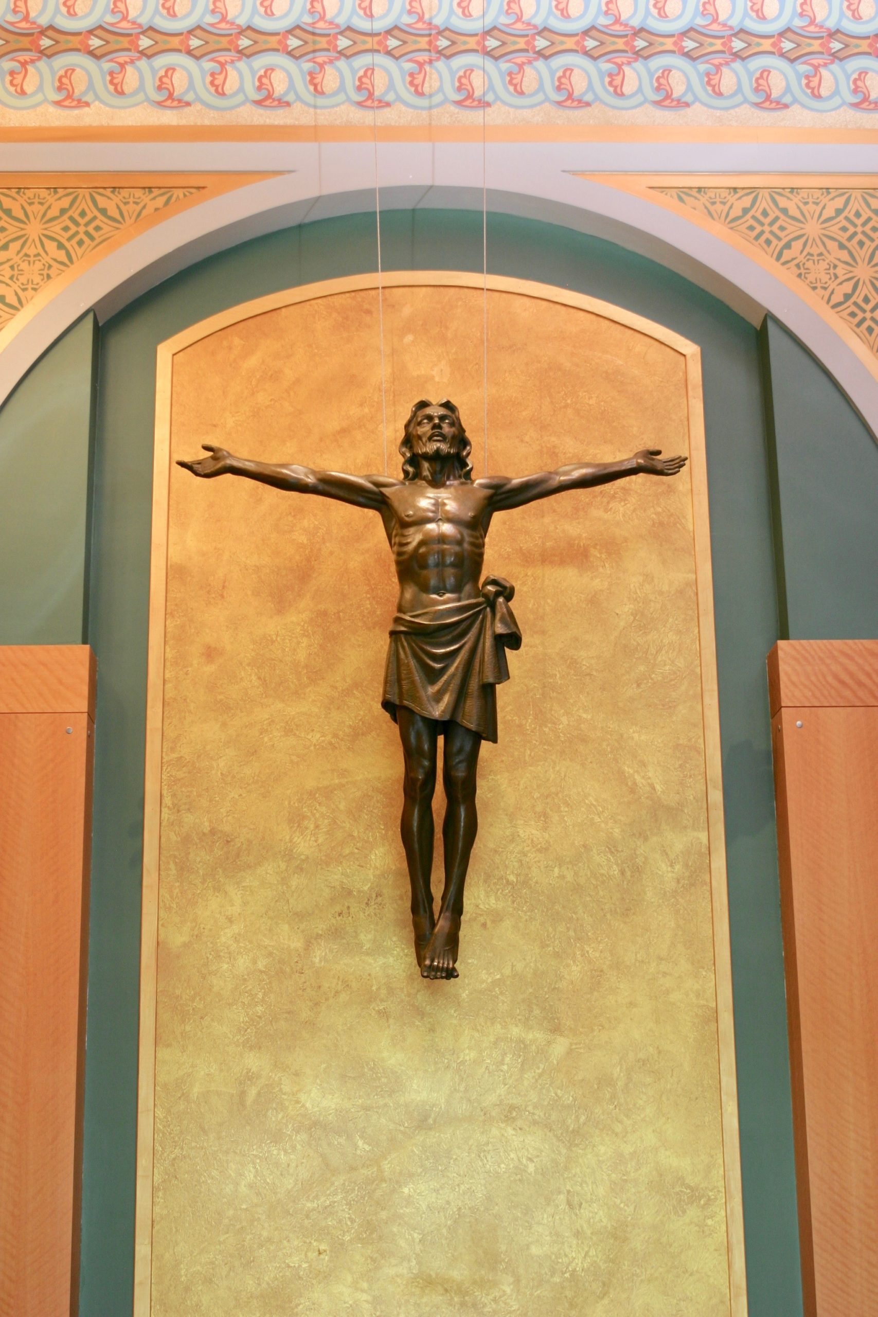 I remember expressing to that first committee that I felt prepared to tackle the image of Christ, but that would not have been true even a few years earlier. I had been sculpting full-time for twenty-six years at that point, but the responsibility seemed daunting. When I came up with the image of the Risen Christ floating before the cross, it opened a door into the project that seemed to reveal the path forward. Christ, not bound by the earth or the laws of nature, suspended in time and space, could represent the totality of the Passion. Arms outstretched, He surrenders to God’s will in the garden. Arms outstretched He hangs upon the cross. Arms outstretched, He rises into heaven. Arms outstretched, He forgives our sins and welcomes us into heaven. Jay Hall Carpenter, Sculptor