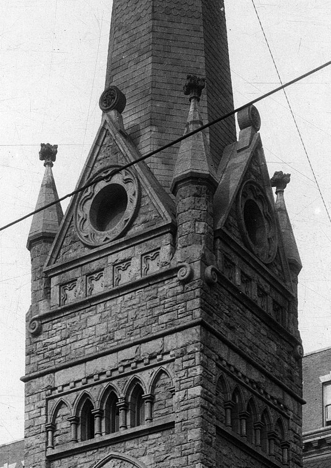 Tops of corners of tower are restored in terne coated stainless steel with polished & gilded stainless steel finials representing the four Gospels. The Owl’s eyes of tower are complemented with ornamental grilles
