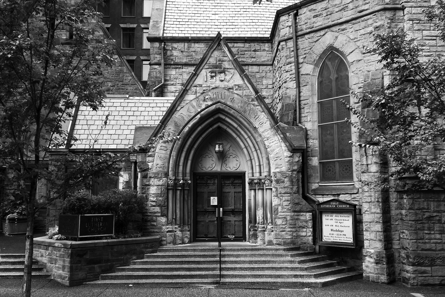 The Restoration & Renovation of First Lutheran Church involves on the exterior: restoration, repair or replacement of deteriorated sandstone masonry; restoration, repair or replacement of stained glass windows as well as repair & repainting wood window frames; replacement of aluminum & glass entrance doors as well as repair & repainting of wood trim & transoms; new louvers for ventilation of attic & tower; replacement & improvements to existing hardscape & landscaping around building along Grant Street & Strawberry Way