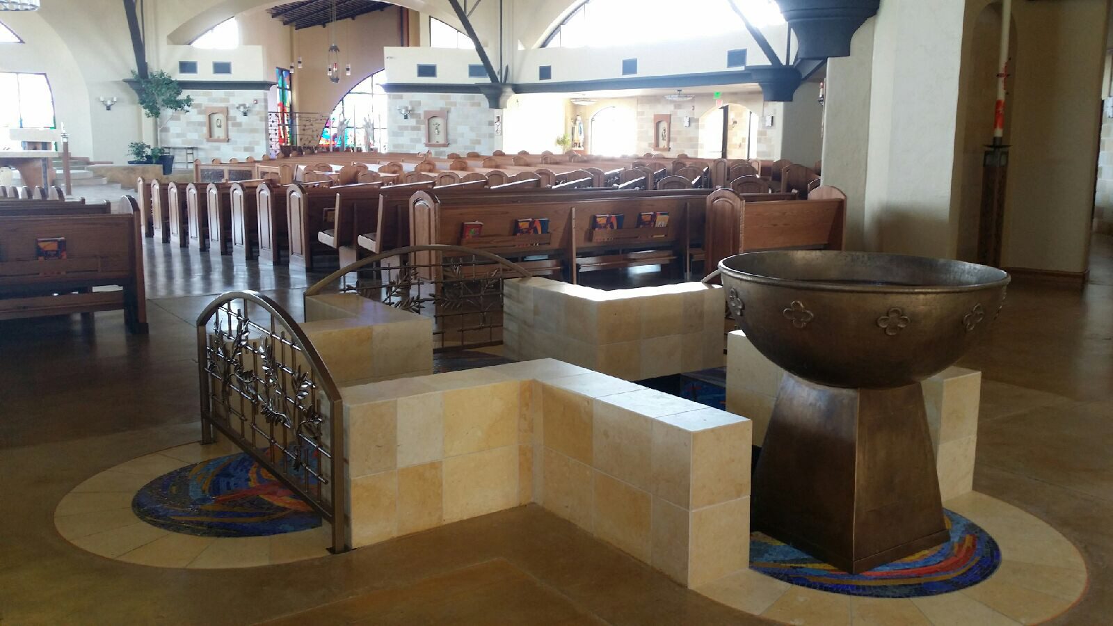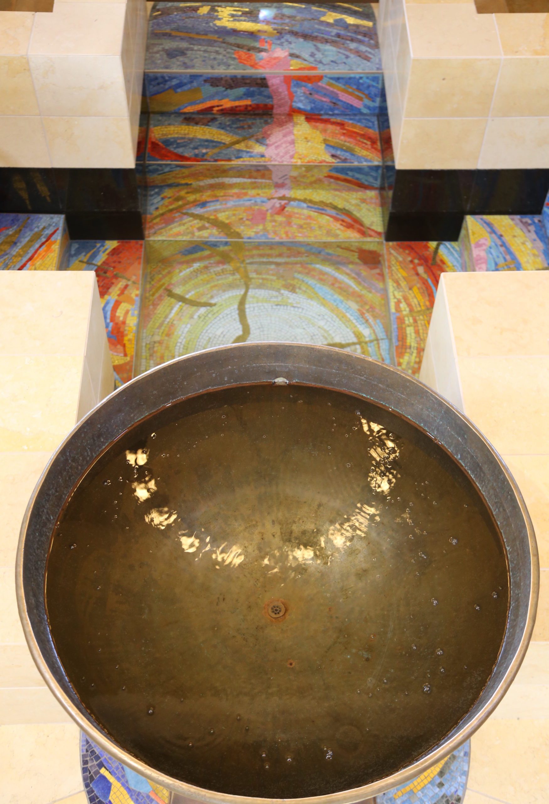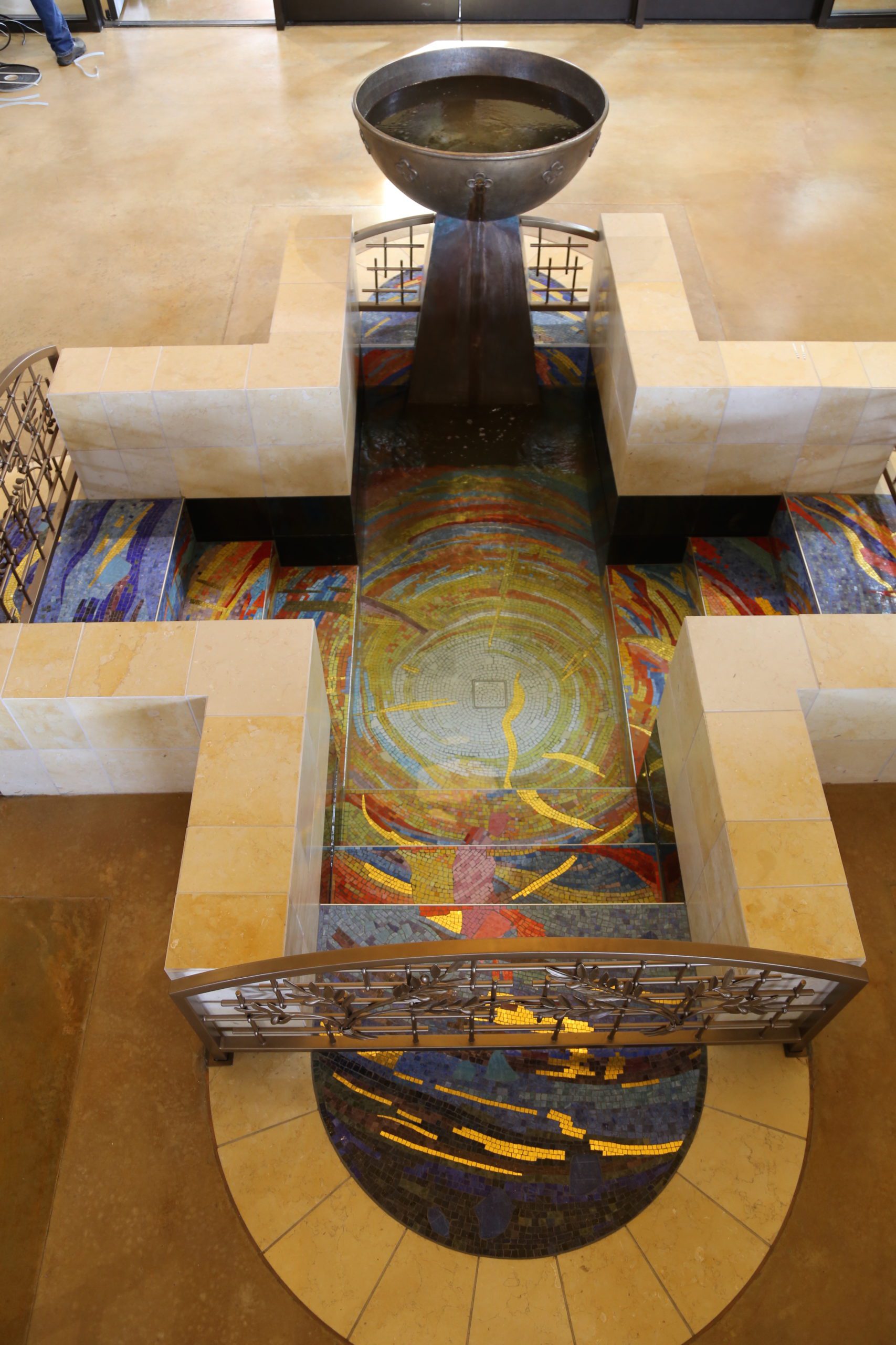 Commissioned by the parish and Hyndman & Hyndman, Architects, the Genesis Baptismal Font mosaic for St. Frances Xavier Cabrini Catholic Church in El Paso, TX was completed in 2016. The design reflects the moment of powerful creation, with a white-hot center and energetic “rays” of 24k gold mosaic radiating outward towards deep space.