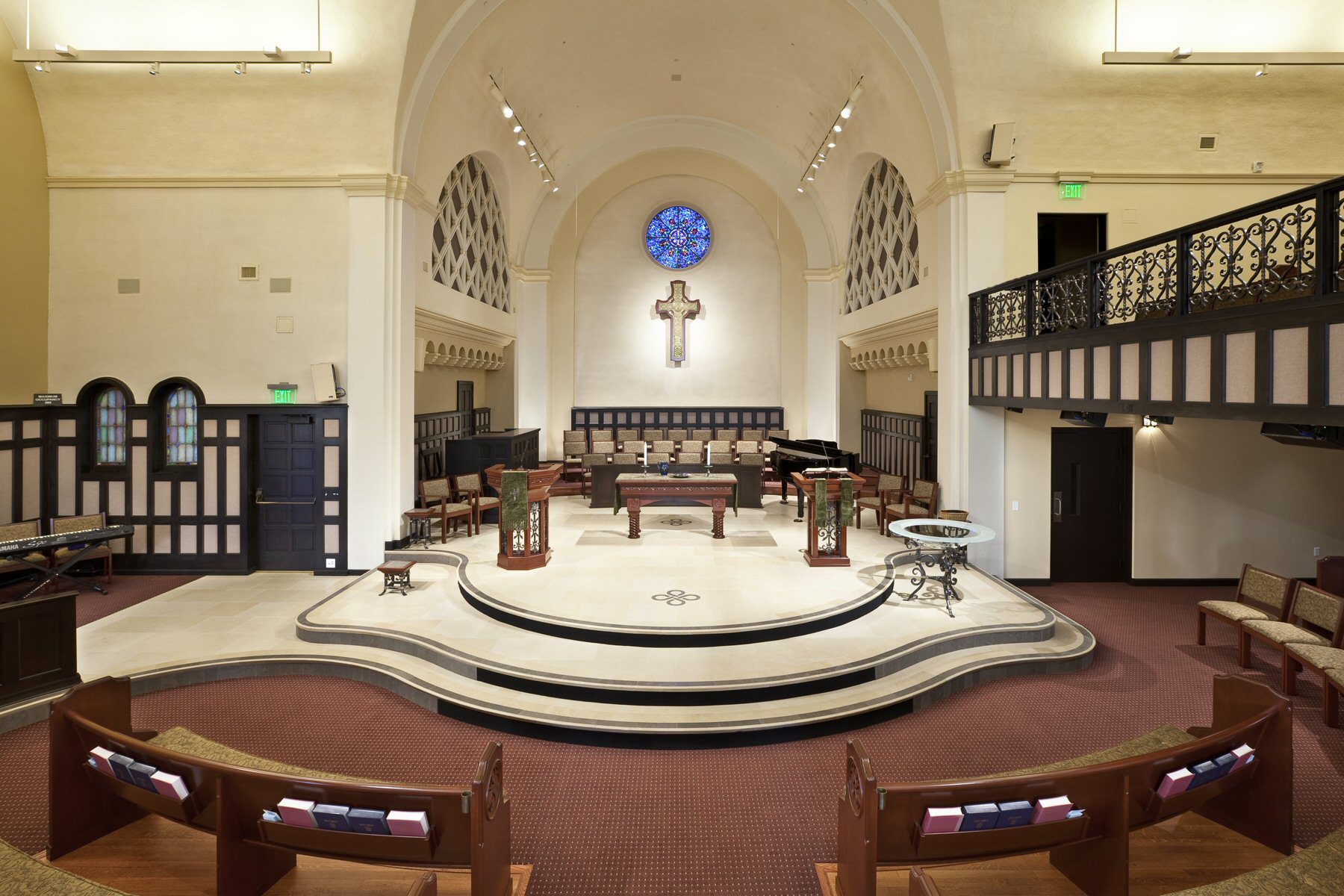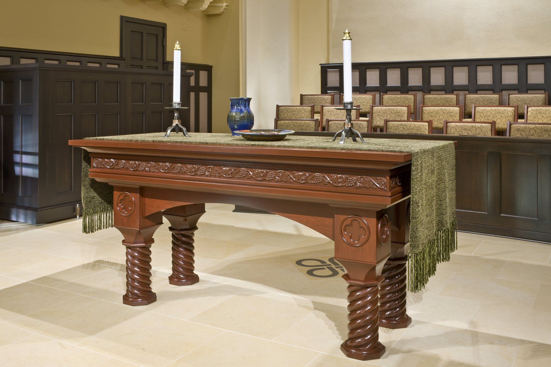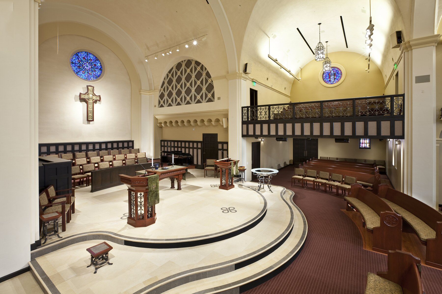 Custom Altar, Pulpit, Lectern, and Pews: Designed by Robert Habiger and fabricated by New Holland Church Furniture