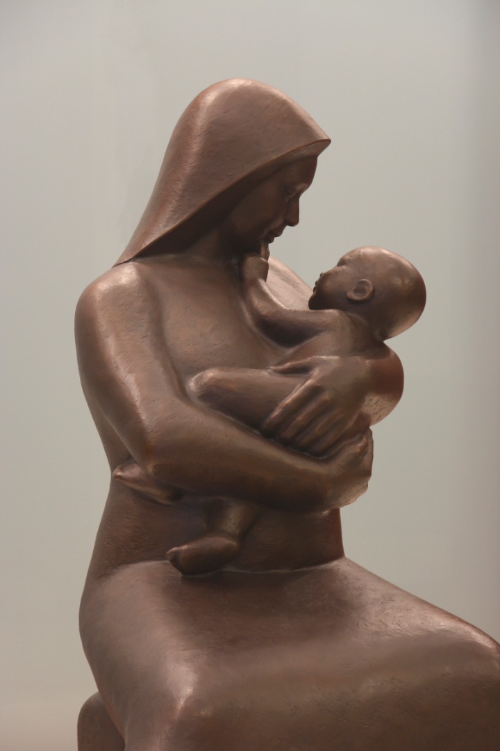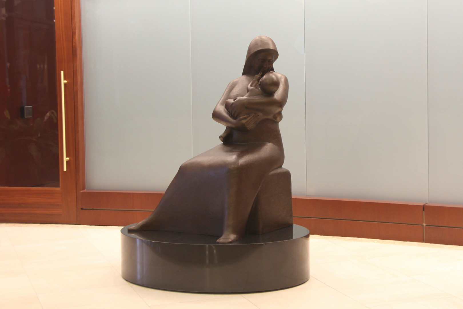 The commission was to create a life-size, bronze, modern Madonna of Compassion to be installed in an oval atrium outside the chapel doors. The sculpture was to be viewed from all four directions: a long hallway in one direction, an exterior entrance, the doors to the administrative offices, and the chapel doors behind the sculpture. Therefore, there would be no front or back–all sides needed to work compositionally in the round and be equally interesting. The baby Jesus could be seen from all four sides. Also, the the theme would be the love and compassion between Mary and Jesus and their interaction with each other.