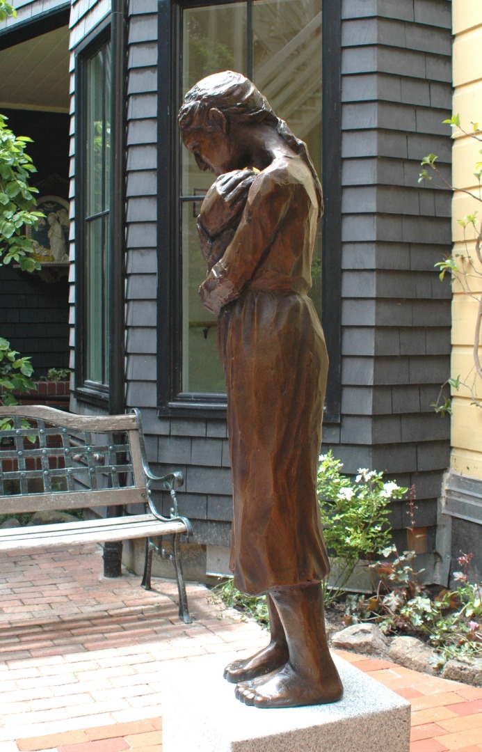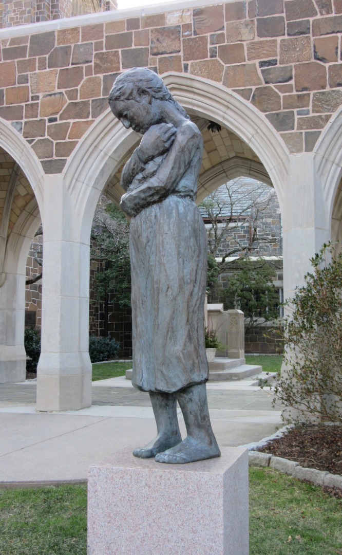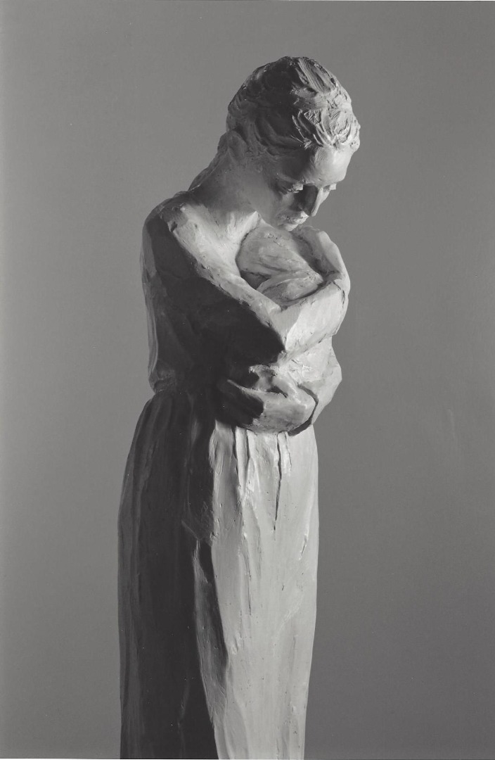 A bronze sculpture of Mary with the infant Jesus. Mary is very young, cradling her child in a protective embrace. The tilt of her head, the meditative expression on her face, and her enclosed posture reveal her prescient understanding of the majesty and suffering that awaits this child, revealed in Simeon's prophetic words in Luke 2:34-35: "This child is destined for the falling and rising of many in Israel…and a sword shall pierce your own soul also."