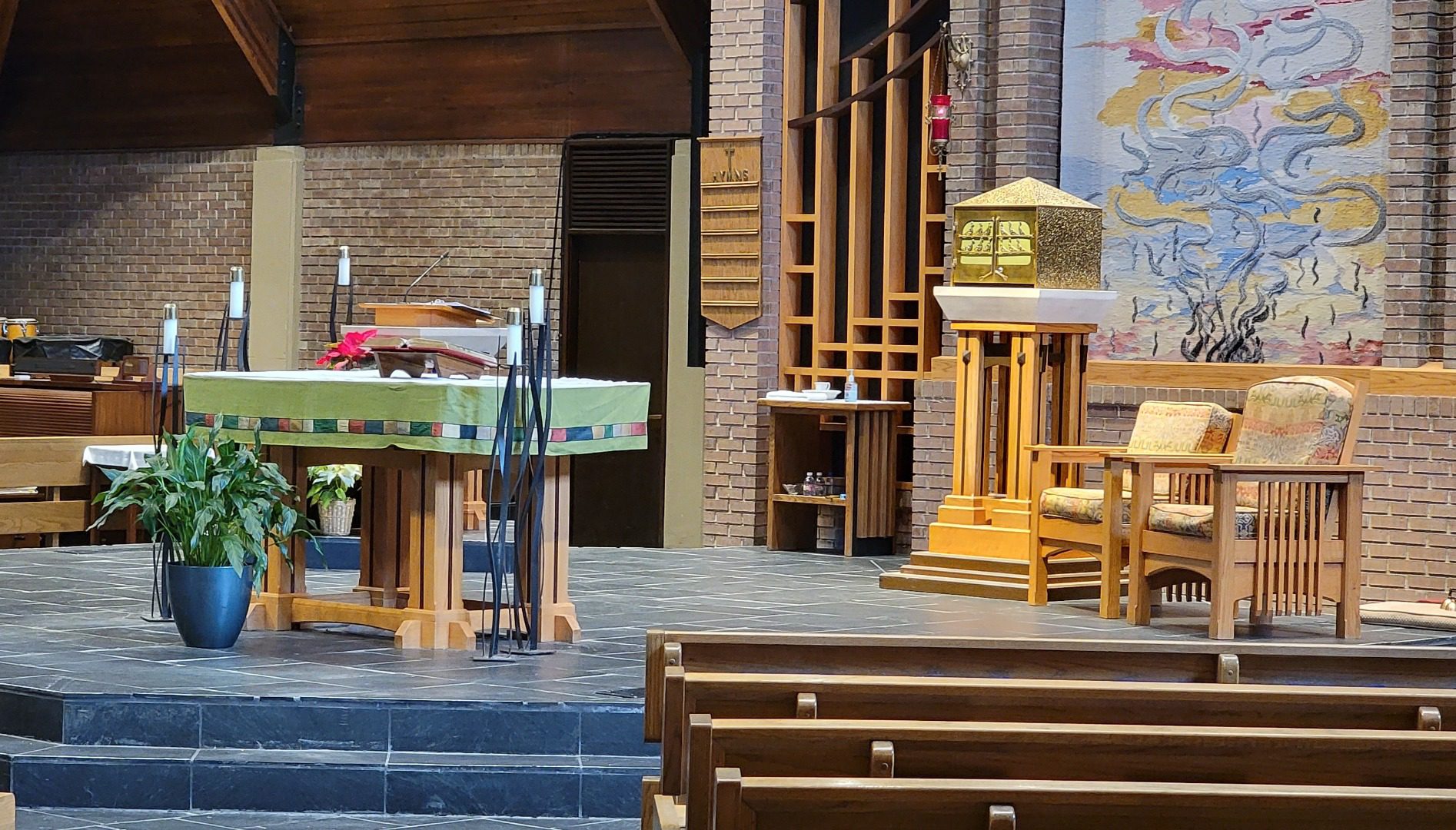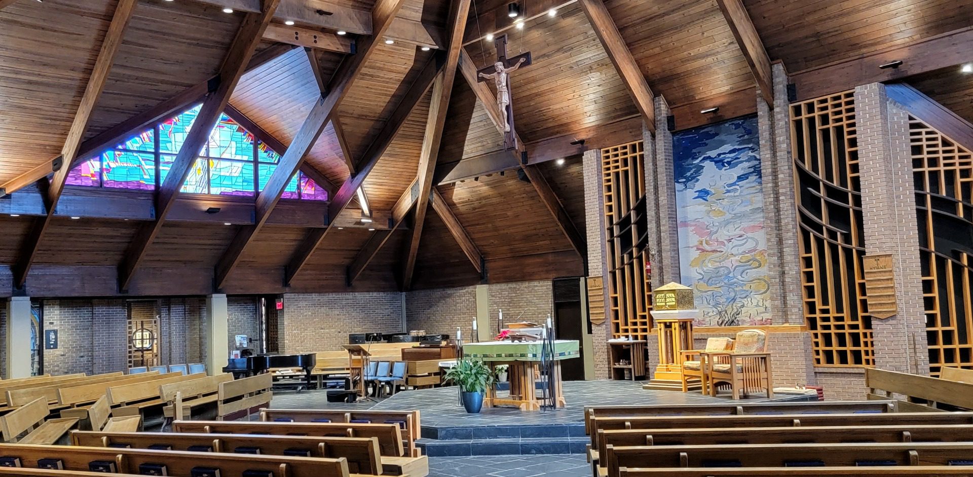 Liturgical artist George R Hoelzeman designed and created the altar, ambo, presider's chair and crucifix for the reconstructed sanctuary based on Arts and Crafts concepts blended with Art nouveau elements. These elements are reflected in the reredos screen and the tapestry designed and woven by Ulrika Leander. Gables were added to the roof and filled with Glassworks by Maureen Mcguire.