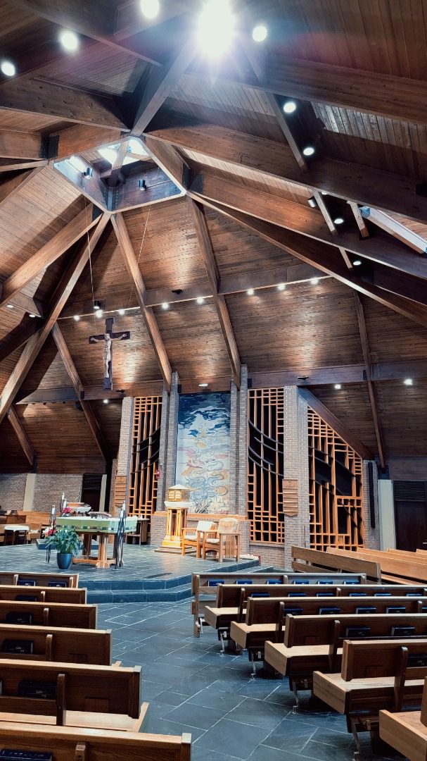 After decades of discussion and surveys OLHS launched a renovation project in 1999. The core architecture of the 1970 church was good, but most found the cavernous interior to be too dark and the thick dall glass to be dated and outmoded. The heaviness of the interior was further emphasized by the massive, 3.5'x8'x4' travertine altar. Parishioners also found the sanctuary backdrop or two large circles painted on fabric to be symbolically incomprehensible (the backdrop was originally intended to be temporary, but remained for almost 30 years).