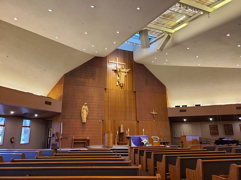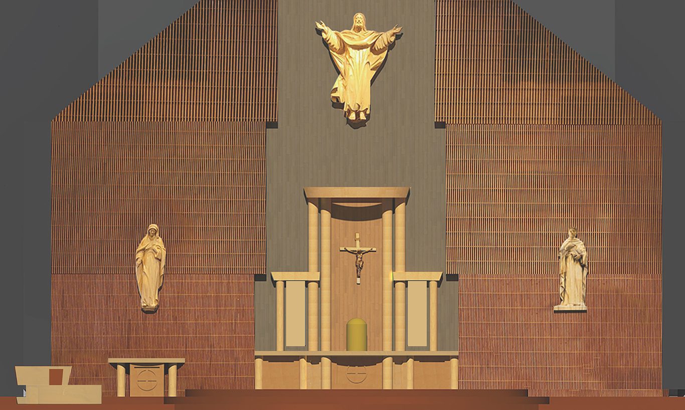 Our project for St. Bonaventure is focused on the transformation of the altar area and the baptistery. A new reredos was designed by CJK Sacred Space. The artifact is hand carved in wood and stained to coordinate with the existing wood icon figures and the wood walls. The materials selected for the central wall area behind the reredos are designed to create a focal point for the Tabernacle and the crucifix. A new icon of St. Bonaventure is being carved to match the existing Virgin Mary for the side wall of the altar. A new adult / infant baptistery and credence table have been designed as well. Careful attention was paid to the nature of the existing Church Architecture which is modern and simple in detail. CJK Studio orchestrated the design, crafting, coordination and installation of the transformation. . Updates for the lighting both natural via the skylights and led fixtures are planned to enhance the new furnishings and icons.