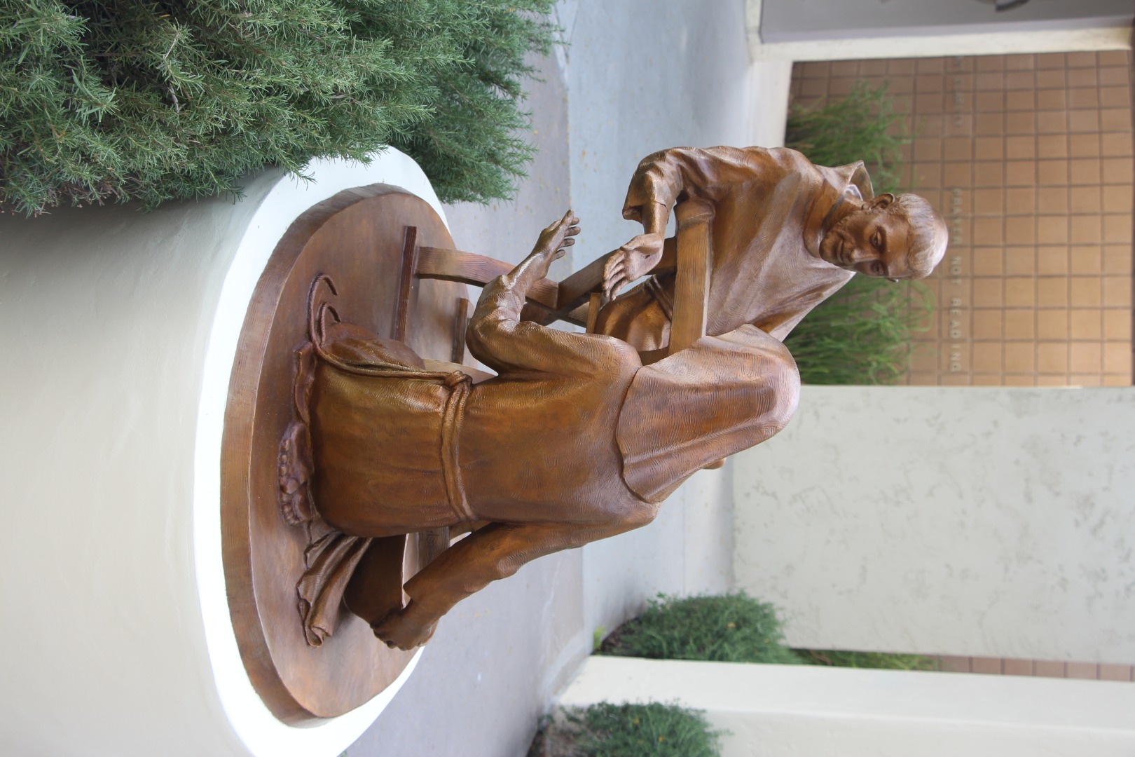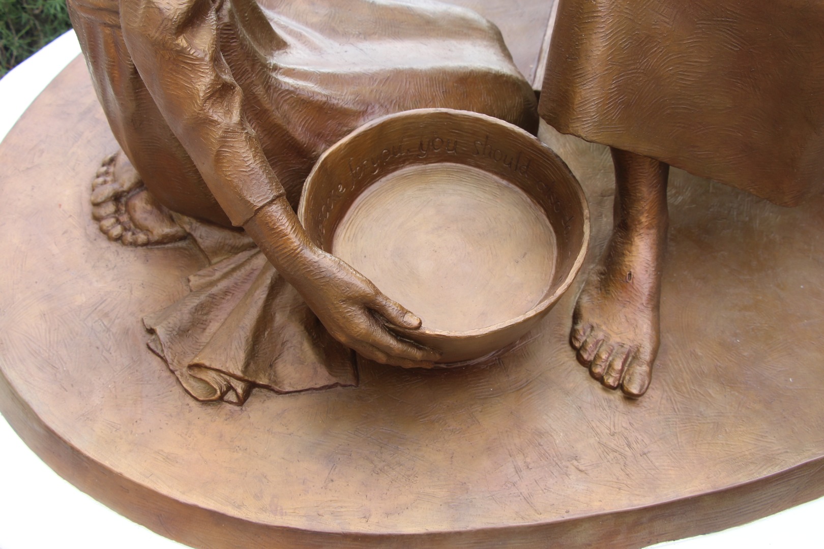 In this sculpture, St. Francis shows St. Clare his stigmata, demonstrating that a life identified with Christ is a call to suffer and to serve. Her posture and position reference Mary of Bethany, seated at the feet of Jesus. Visually, we recongnize that St. Francis was an image bearer who shared in the life and sufferings of Christ through the manger-like chair in which he sits, the bowl and towel at his feet, and the physical stigmata upon his hands. Inscribed inside the bowl are Jesus' words to the disciples as he washed their feet: "As I have done for you, so you should also do." (John 13:15) St. Francis points us to Christ and invites us to follow him.