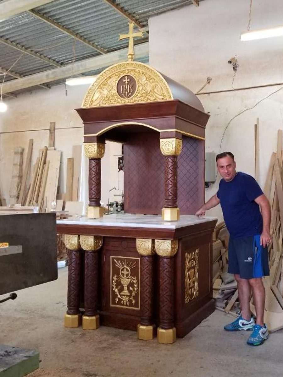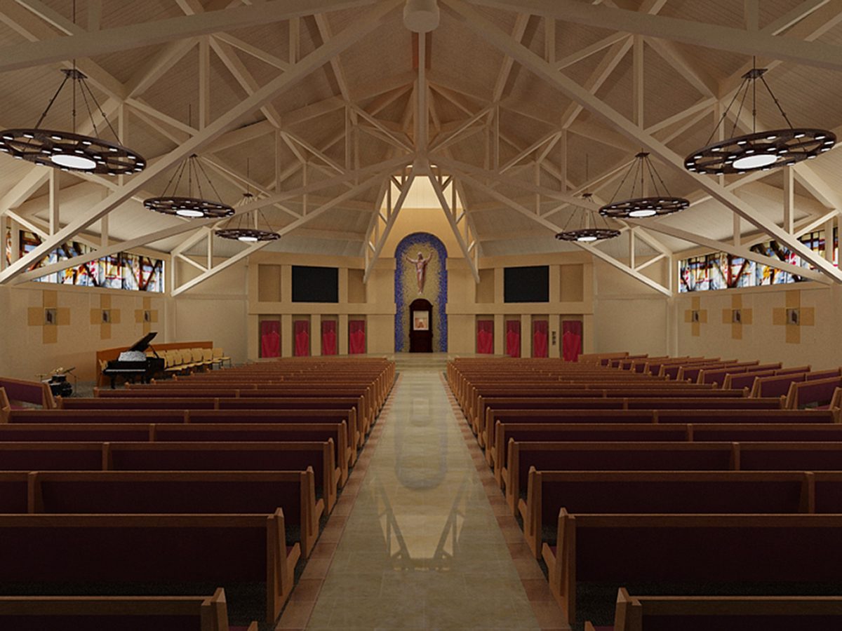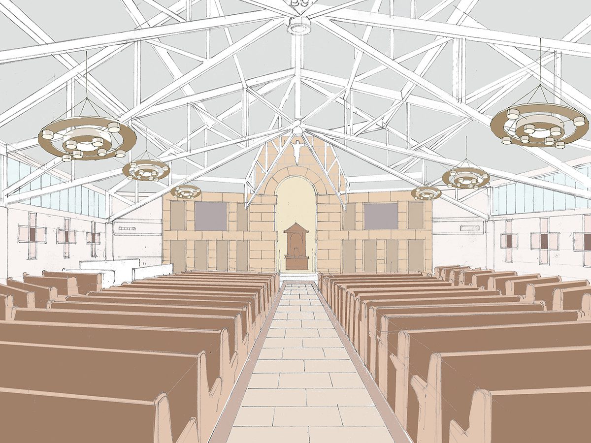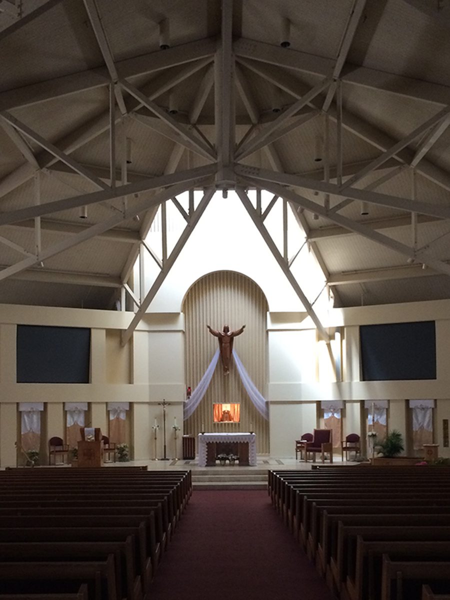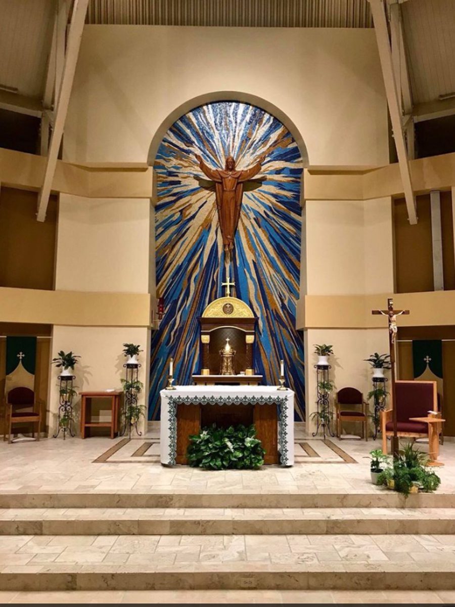 Our project for St. Raymond’s was focused on the transformation of the altar. A new reredos was designed by CJK Sacred Space. The artifact is hand carved in white oak, stained and gilded in 22.5 karat gold leaf. A glass and marble mosaic was designed for the altar wall to enhance the space and add a dramatic backdrop for the ascending Christ figure. The crafting and installation of the mosaic was done by our studio. The photos illustrate the dramatic transformation of the existing space.
