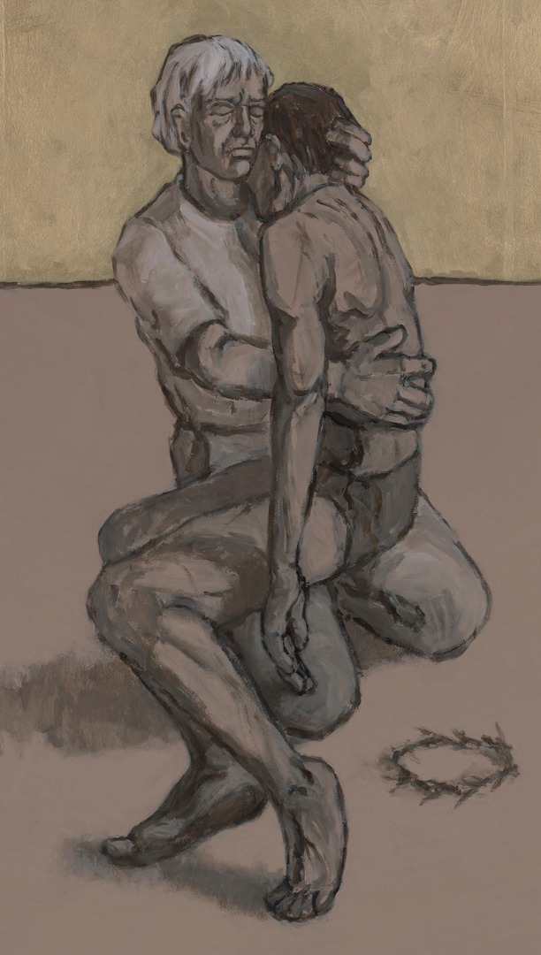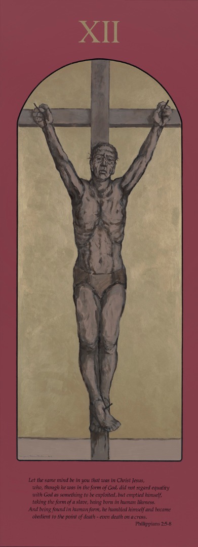 14 large wooden panels depict Jesus's Journey to the Cross with contemporary figures rendered in muted browns. The gold paint of the background evokes the icon tradition, while the deep red of the outer panels calls to mind the rich colors of Medieval images. Old Testament texts at the bottom of each panel are passages traditionally considered to "prefigure" the Passion. The sole New Testament text, for the Crucifixion, is the Christ Hymn from Philippians 5:2-11.