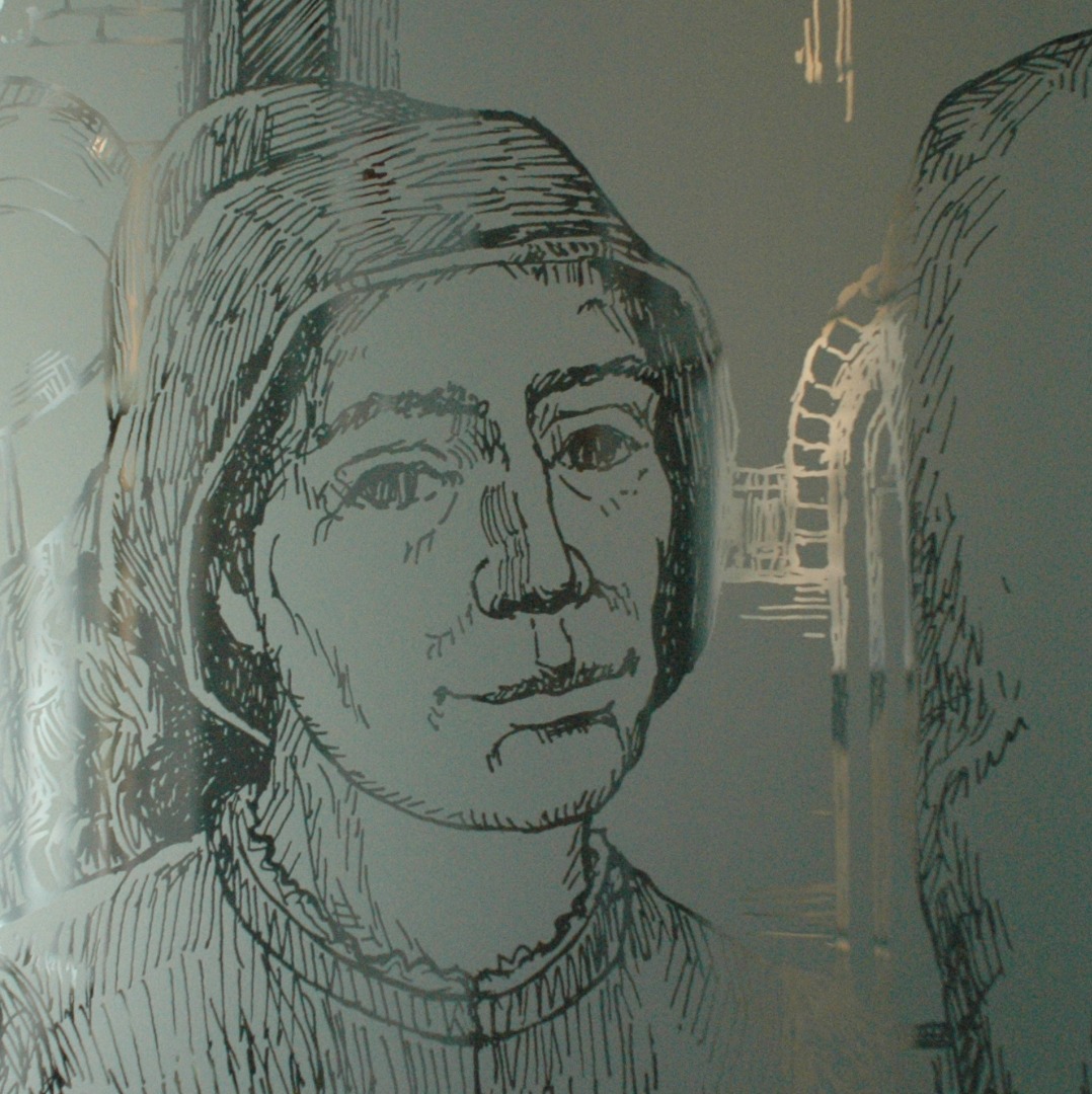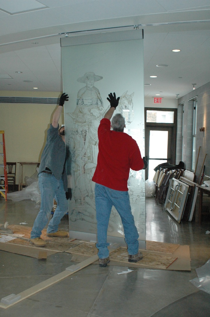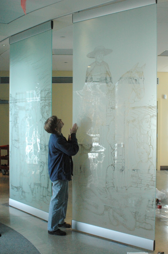 The Communion of Saints are rendered in etched glass on eight movable glass panels and a door (each over 9 ft tall and the assembled panels totaling 30 ft wide) in the new sanctuary of St. Agnes Catholic Church. The glass panels enclose a Day Chapel (used for smaller services), separating the smaller chapel from the adjacent entrance narthex. The glass panels can be rolled out of the way to combine chapel and narthex into a larger gathering space. The life-sized figures are drawn from scripture and from the history of the church, the parish, and the town of Shepherdstown.