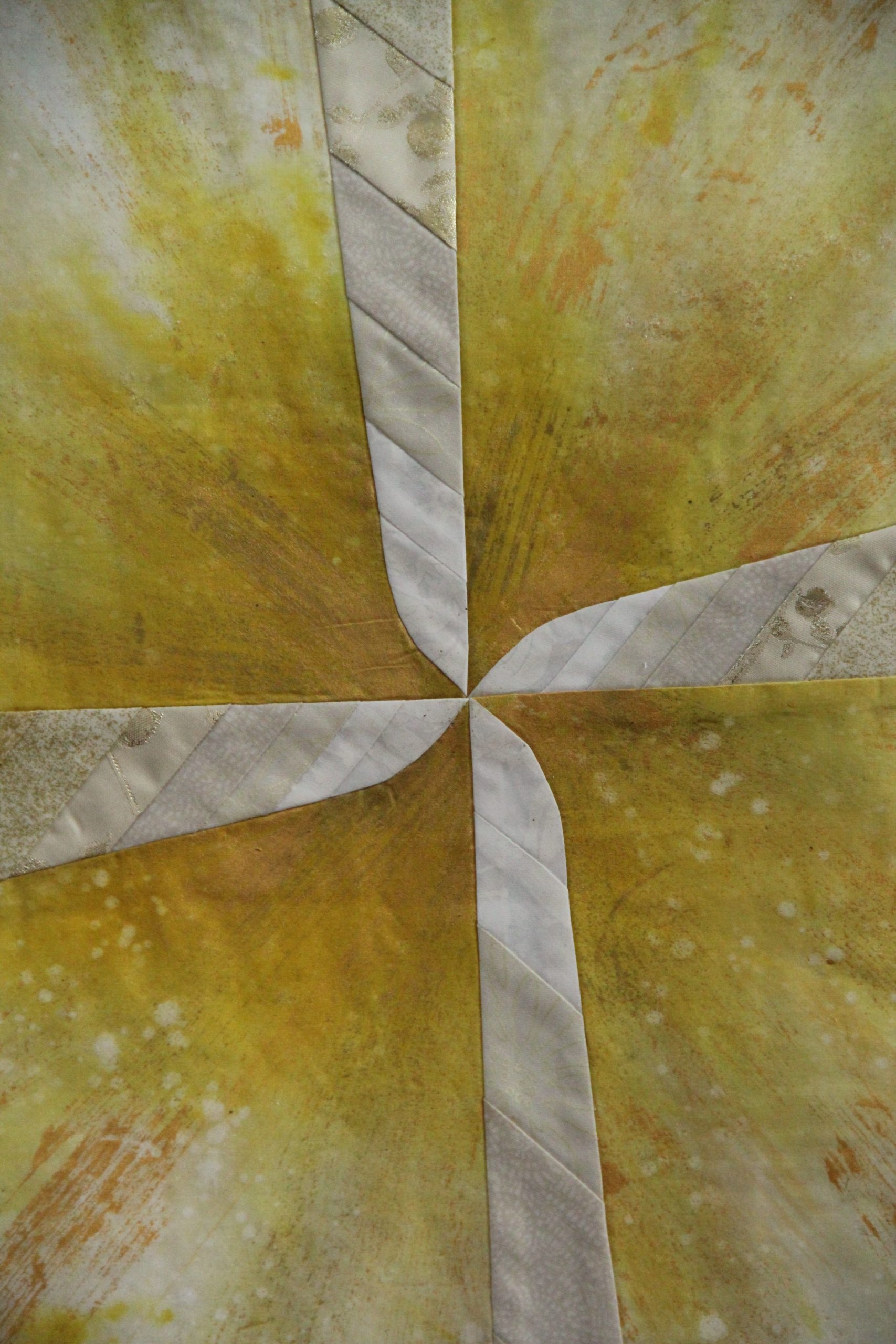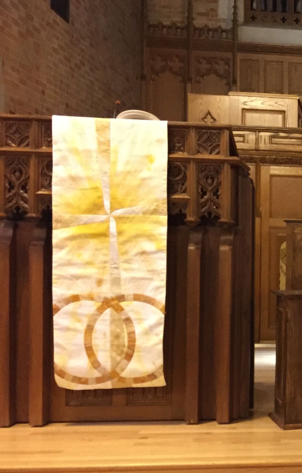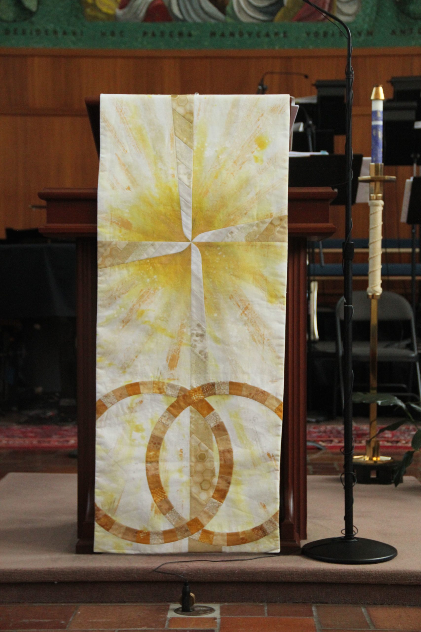 This set of wedding paraments was commissioned by the First Presbyterian Church, using a donation from a member of the church who had been recently married there. A special set of paraments for weddings was an unusual request, but most appropriate and timely. To me, the use of such a set of paraments emphasizes the essential importance of marriage to the church and the world, and signals implicit participation of the the community, whether present or not. In addition, these particular paraments emphasize the reality that the bride and groom make their vows in Christ. The wedding banner depicted here was made the the wedding of the artist’s son, but would complement the paraments. Pamela T Hardiman Fargo, ND